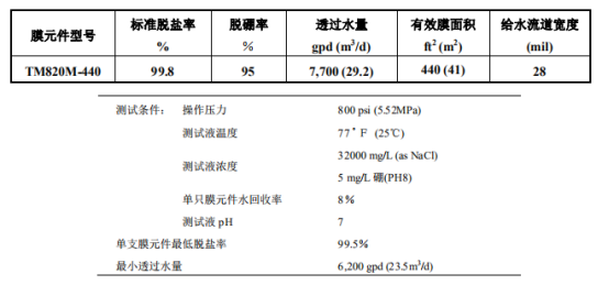 東麗TM820M-440海水淡化膜元件,有效膜面積為440平方英尺,它具有世界高水準(zhǔn)的脫硼率和脫鹽率,除鹽性能好且穩(wěn)定,可保證在高回收率的條件下從海水中獲取高質(zhì)量的透過水。