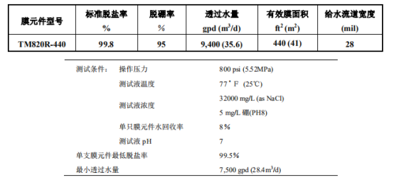 東麗TM820R-440海水淡化膜元件,有效膜面積為440平方英尺,它具有世界高水準(zhǔn)的脫硼率和脫鹽率,除鹽性能好且穩(wěn)定,可保證在高回收率的條件下從海水中獲取高質(zhì)量的透過(guò)水。適合于高濃度海水的淡化處理。廣泛應(yīng)用于高回收率系統(tǒng)的海水淡化和苦咸水淡化,來(lái)制造對(duì)硼離子有嚴(yán)格要求的各種工業(yè)用水和生活用水,也應(yīng)用于廢水再利用,如食品、電鍍金屬等有價(jià)物質(zhì)的濃縮回收在內(nèi)的多種領(lǐng)域。