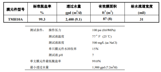 東麗TMH10A極超低壓反滲透膜元件,適合于含鹽量1000ppm以下的苦咸水、地表水以及自來水的淡化和深度處理。具有極超低的運行壓力(在較低的操作壓力下,如測試壓力0.69Mpa,即可達(dá)到較高的產(chǎn)水量)和在較小的膜面積下有較高的產(chǎn)水量。廣泛用于小規(guī)模的電子工業(yè)超純水、發(fā)電廠鍋爐補給水等各種工業(yè)用水以及飲料用水的制造,也應(yīng)用于廢水的再生利用等多種苦咸水淡化領(lǐng)域。