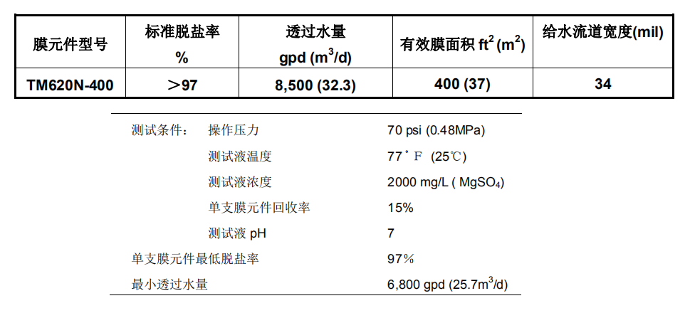 東麗TM620N-400納濾膜參數(shù)性能表: