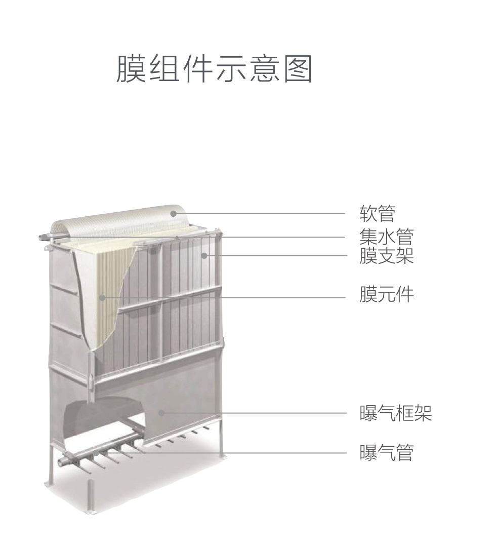 一套東麗MBR膜組件由一套膜箱、一套不銹鋼框架和一套曝氣箱組成,每個膜元件箱體內(nèi)包含按照固定間隔排列的膜元件;每片膜元件由支撐板和兩面膜片粘貼而成。每個膜元件通過水管連接到集水管,曝氣箱內(nèi)含有提供空氣的曝氣管。